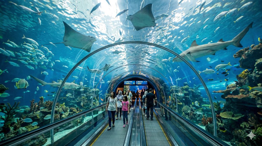 The undisputed crown jewel of the attraction is the 90-meter underwater tunnel. Equipped with a moving travelator, the tunnel allows you to stand still as the ocean moves around you. Looking up through the transparent glass, you’ll see Sand Tiger sharks with their jagged teeth, majestic stingrays with wingspans like small aircraft, and green sea turtles swimming gracefully overhead. It is an immersive, 360-degree experience that makes you feel like a diver without ever getting wet.