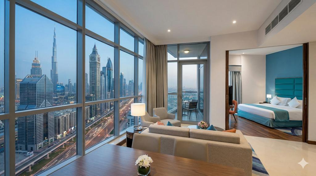 The hotel features over 200 suites, ranging from one to three bedrooms. Each suite is equipped with a separate living room, dining area, and kitchenette. The contemporary decor and floor-to-ceiling windows provide a bright, modern feel. For the ultimate luxury, book the Presidential Suite which spans the entire 25th floor and offers panoramic views of Dubai.
