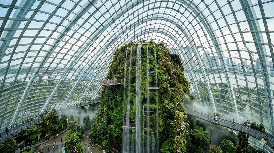 The Cloud Forest: This misty conservatory houses a 35-meter-tall indoor waterfall and replicates the cool-moist climate of tropical highlands. It features an immersive Jurassic World experience, blending prehistoric giants with rare prehistoric-era plants like cycads and ferns.